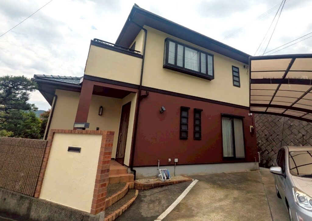 施工後がこちら!1階と2階で色分けした外壁は、ご主人の希望で玄関部分のみ明るい色に合わせました。そのおかげで暗い印象にならず、素敵に仕上がっています。毎日の出入りが楽しくなりますね。