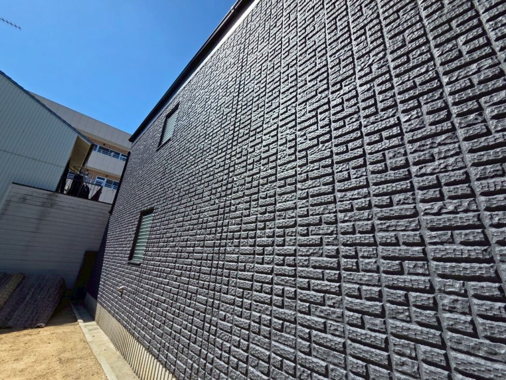 凹凸の大きな壁面は普段の手塗りではローラーが隙間に入らず塗りムラが出来てしまうので、吹き付け塗料を何度も重ねてムラなく仕上げました。